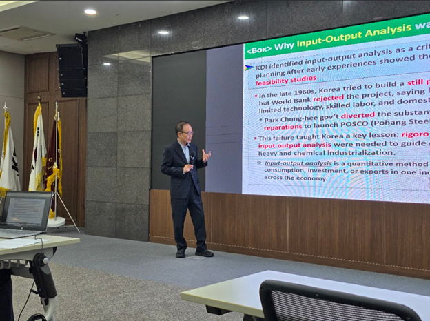 The lecture then turned to the story of KDI itself, founded in 1971 as a government-sponsored think tank tasked with providing evidence-based policy research. Dean Kim described how its early work, supported by U.S. aid and guided by Harvard advisors, shaped Korea’s industrial and social policies. Input-output analysis became a cornerstone of KDI’s approach, allowing policymakers to make informed decisions on complex industrialization strategies, such as the development of heavy and chemical industries.