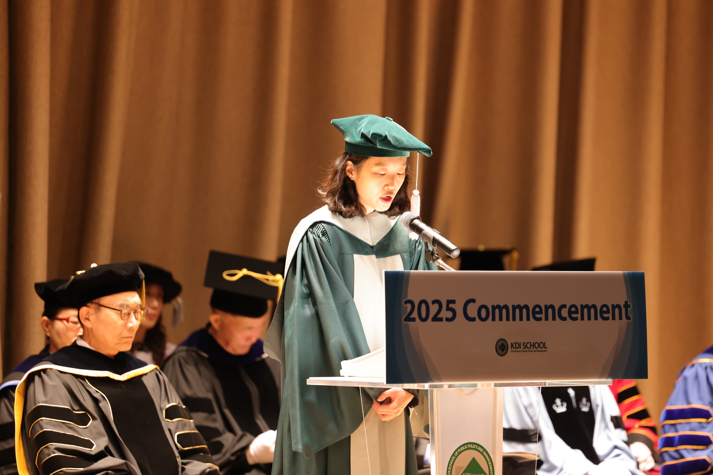 Delivering the valedictory address, Ms. Soyeon Shin spoke about navigating two complex and seemingly opposite fields: the military and academia. While the former demands quick decisions and immediate results, the latter embraces uncertainty and encourages constant questioning. Through her KDIS education, she said she became a stronger advocate of research, emphasizing that decision-making without scientific analysis is dangerous. In her final words, she expressed gratitude to the community she found at KDI School: “You expanded my world… Because of you, I no longer see foreign nations, I see the homes of my friends.”