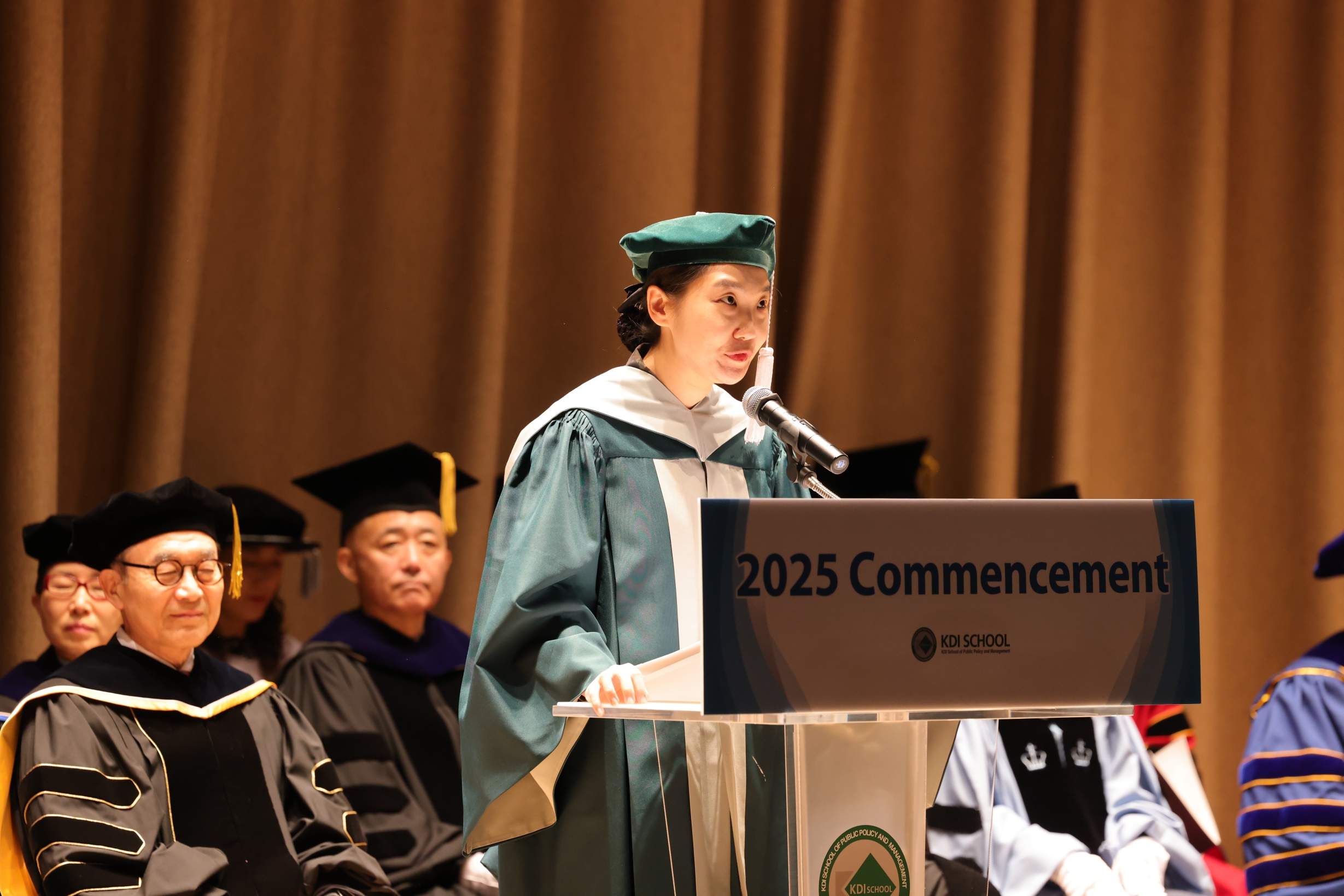 In her convocation speech, Ms. Minseon Jang shared that while working in government, she often forgot the reason she chose public service in the first place—but staying at KDI School reminded her of it. She added that the experience reignited her passion and commitment to serve. “Our time in KDI School has come to an end, but our mission has just started. Go back to serve our societies and make meaningful actions,” she said.
