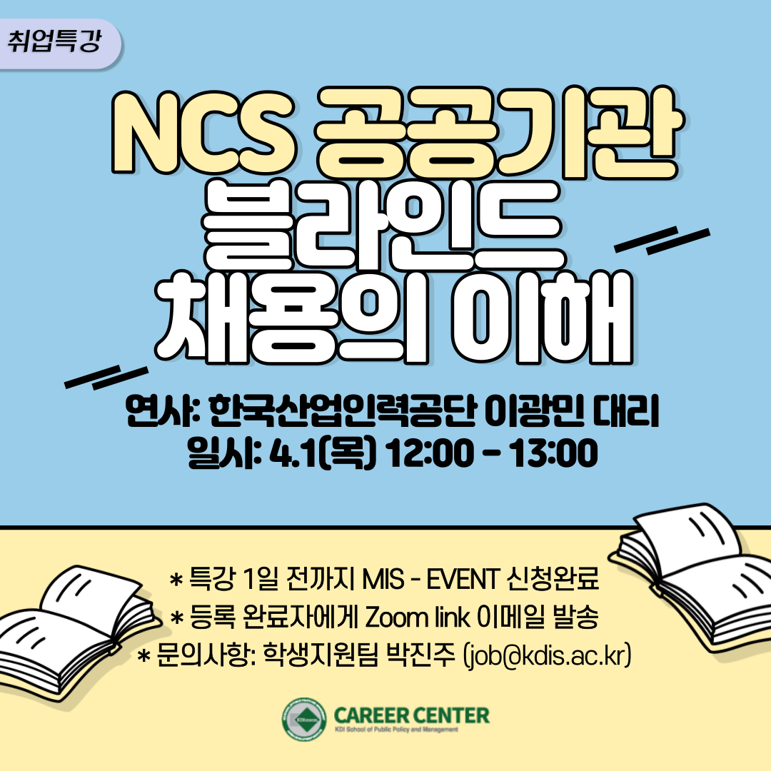 관심있는 한국인 재학생분들은 MIS에서 [취업특강] NCS 공공기관 블라인드 채용의 이해 등록부탁드립니다! ^^