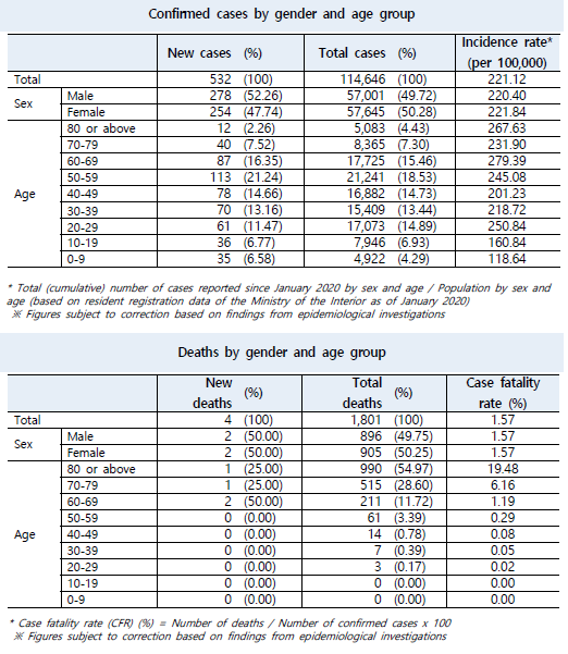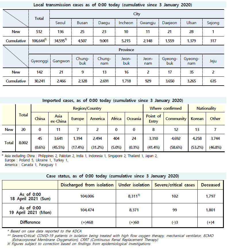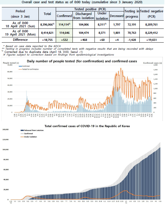 The updates on COVID-19 in Korea as of April 19 from KCDC (+532)