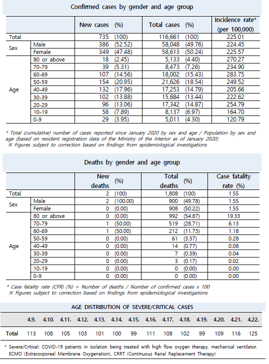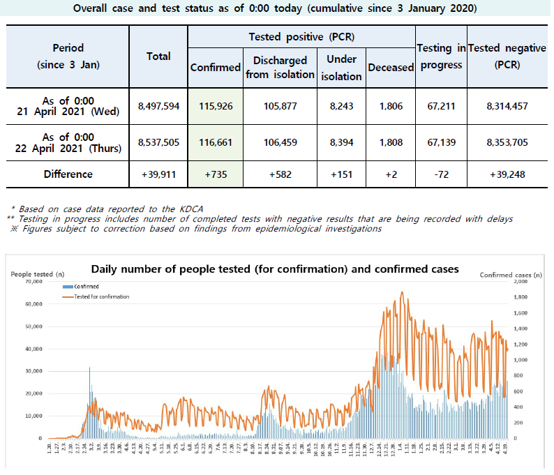 The updates on COVID-19 in Korea as of April 22 from KCDC (+735)