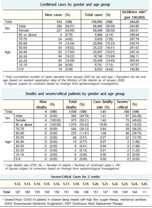 The updates on COVID-19 in Korea as of May 25 from KCDC (+516)