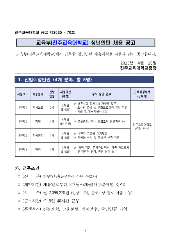 교육부(진주교육대학교) 청년인턴 채용 공고
