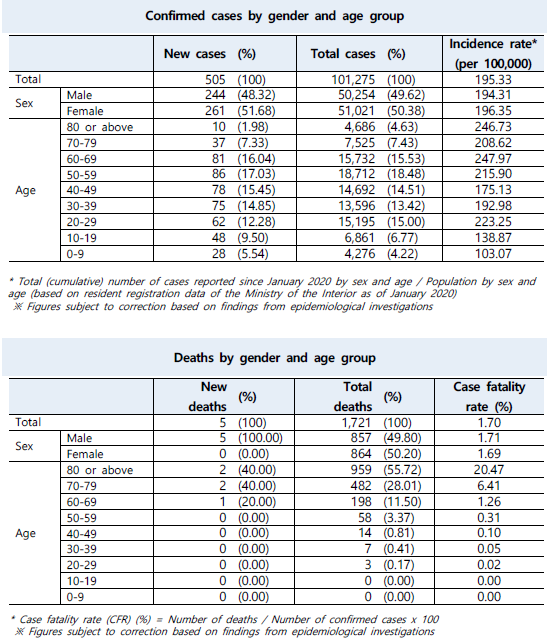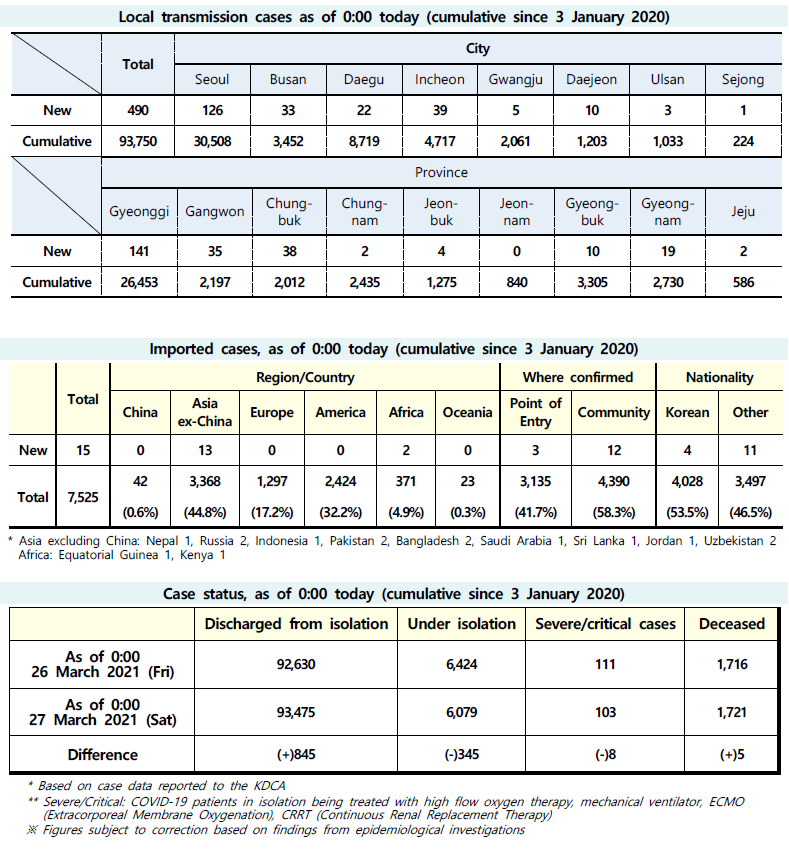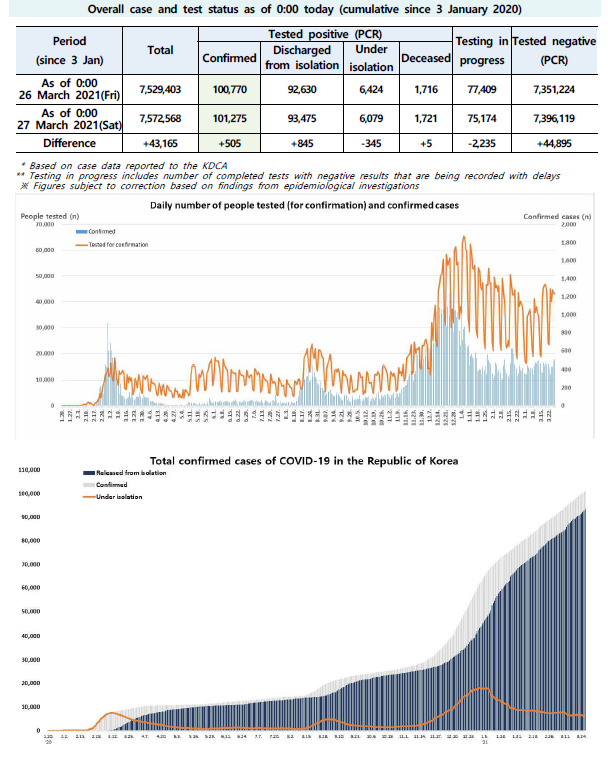 The updates on COVID-19 in Korea as of March 27 from KCDC (+505)