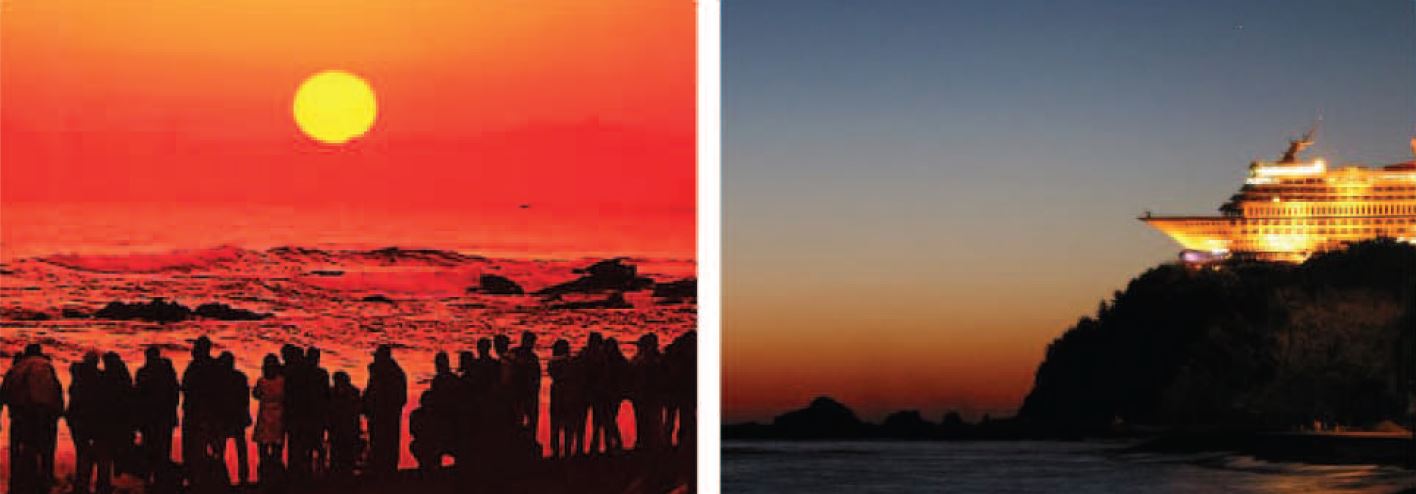 On the nearby hills at the very edge of the mountains sits the famous “Sun Cruise Hotel,” which is an exact copy of a big ocean liner. At first glance, a 5,000 won entrance fee might seem a bit pricey, but you will see that it is worth every won once you get inside. From its observation platform, you can enjoy a spectacular birds-eye view of the whole Jeong-Dong- Jin area, including its 1km of fine white sandy beach, the East Sea, Jeong-Dong- Jin Station and the seaside road. There is also a special stand on the very end of the platform for you to spread out your arms and scream “I’m the King of the World!” as Leonardo did in Titanic. You will feel as if you are on an actual ship drifting at sea.