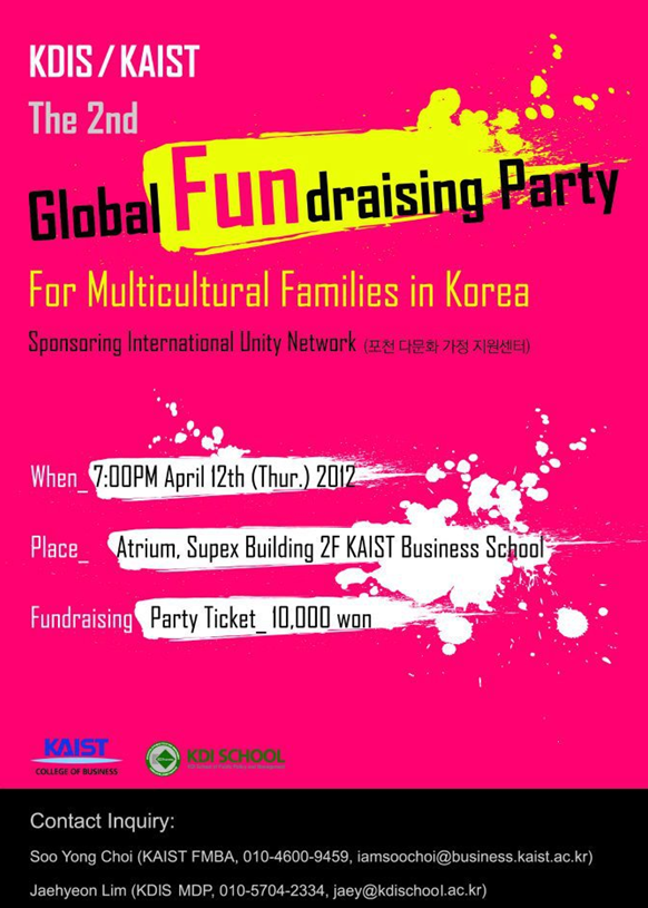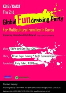 The 2nd Global Fundraising party was held at KAIST Supex Building on Thursday, April 11th. Inspired by the charity work of the international community that followed a catastrophic tsunami in Japan, the event has been launched last year by the students’ passion to join hands and give back to the society. The aim of this year’s fundraising was to raise public awareness about the discrimination against multicultural families in Korea and also to provide support for the International Unity Network, a non-profit organization working to empower multicultural families through job training for adults and alternative education for children.