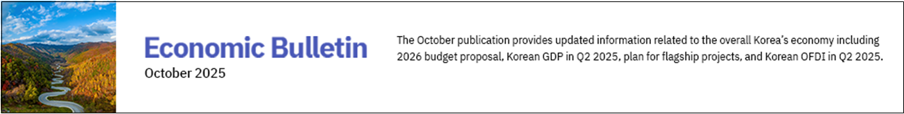 The October publication provides updated information related to the overall Korea’s economy including 2026 budget proposal, Korean GDP in Q2 2025, plan for flagship projects, and Korean OFDI in Q2 2025.