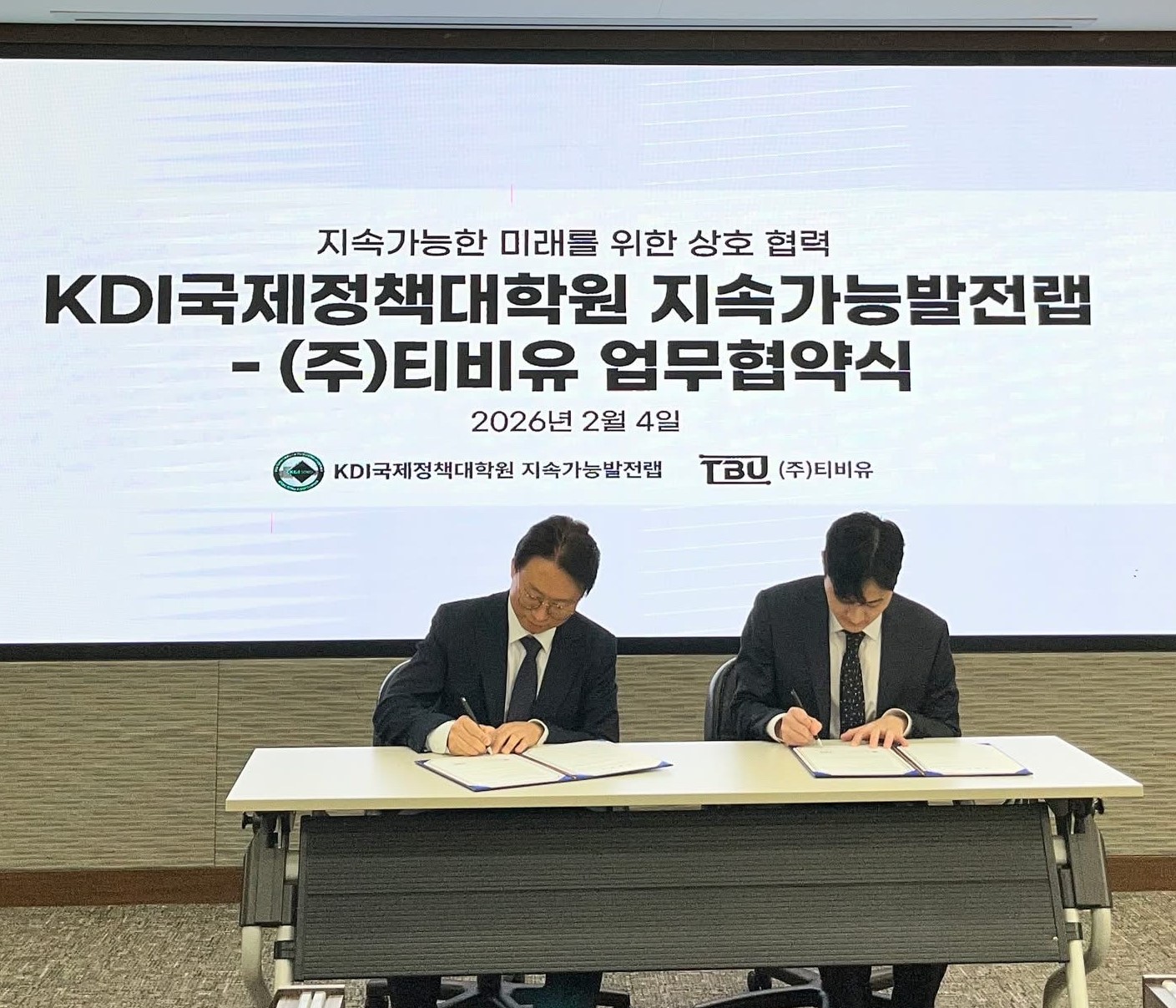[Professor Yeong Jae Kim of KDI School (left) signing the MOU with CEO Sangjin Baek of TBU Inc. (right)]
