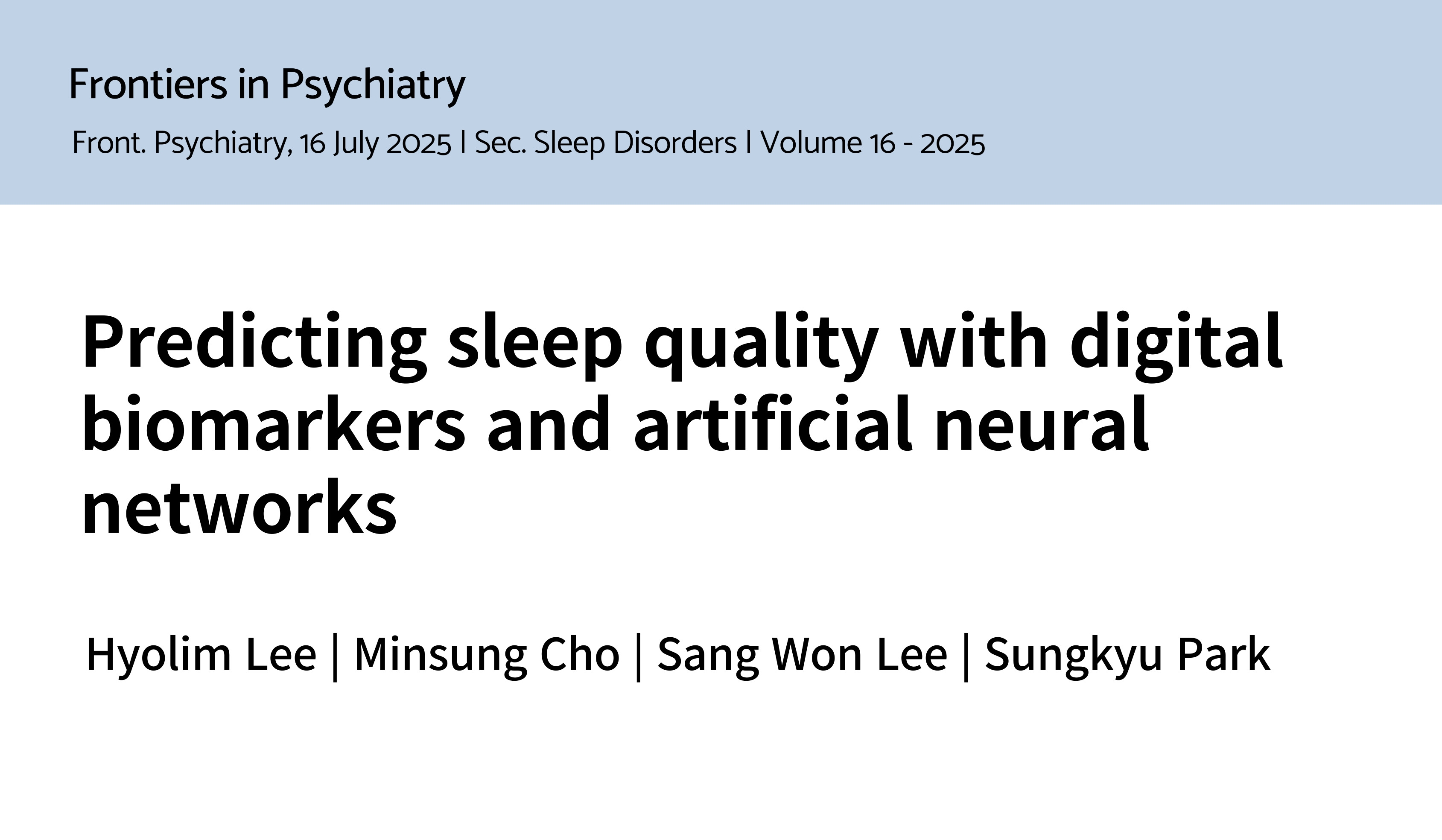 Professor Sungkyu Park presents a novel methodology for predicting sleep quality using digital biomarkers collected from wearable devices and artificial neural networks. Unlike previous studies that primarily relied on short-term HRV measurements in clinical settings, this research developed a model to predict next-day wake after sleep onset (WASO) based on continuous heart rate variability (HRV) data collected from 82 participants wearing Samsung Galaxy Watch Active 2 devices during their daily lives. The study found that among HRV features, the LF/HF ratio showed the strongest correlation with WASO, and the LSTM deep learning model achieved the highest performance with an accuracy of 90.4%. LIME analysis confirmed that the LF/HF ratio, along with Insomnia Severity Index (ISI) and World Health Organization Quality-of-Life Brief Version (WHOQOL-BREF) scores, were the most influential factors for model predictions. These findings provide crucial evidence for establishing public health policies aimed at early detection and prevention of sleep disorders at the population level through personalized sleep health monitoring systems using wearable devices.